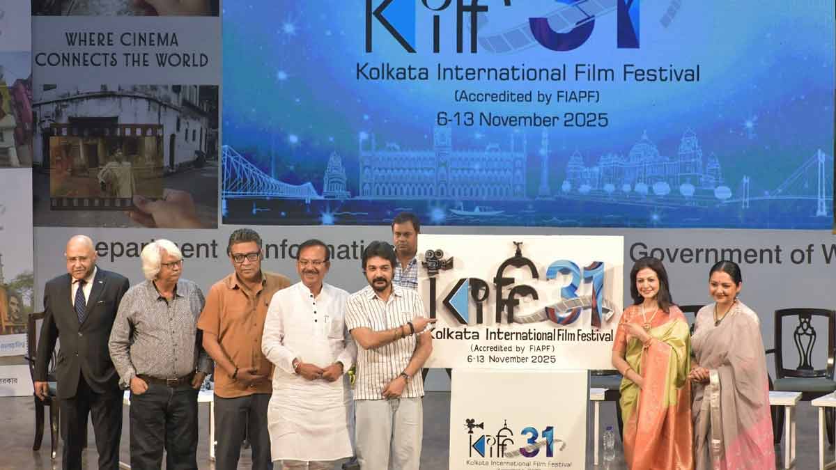 ৩১তম কলকাতা আন্তর্জাতিক চলচিত্র উৎসবের সাংবাদিক সম্মেলনে উপস্থিত মন্ত্রী অরূপ বিশ্বাস, ইন্দ্রনীল সেন, তথ্য ও সংস্কৃতি দফতরের সচিব শান্তনু বসু, অভিনেতা প্রসেনজিৎ চট্টোপাধ্যায়, অভিনেত্রী কোয়েল মল্লিক, অভিনেত্রী ও সাংসদ জুন মলিয়া, পরিচালক হরনাথ চক্রবর্তী, পোল্যান্ডের প্রতিনিধি জয়দীপ রায়। ছবি: রাজীব বসু