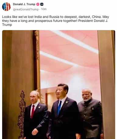 কোলফিল্ড টাইমস: ডোনাল্ড ট্রাম্প আবারও ভারতকে নিশানা করলেন। শুক্রবার তিনি নিজের ট্রুথ সোশ্যাল অ্যাকাউন্টে প্রধানমন্ত্রী নরেন্দ্র মোদী, রাশিয়ার প্রেসিডেন্ট ভ্লাদিমির পুতিন এবং চিনের প্রেসিডেন্ট শি জিনপিংয়ের একসঙ্গে তোলা একটি ছবি শেয়ার করেন। সেই ছবির সঙ্গে ট্রাম্প লিখেছেন, “মনে হচ্ছে আমরা ভারত ও রাশিয়াকে চিনের কাছে হারিয়েছি। ওদের দীর্ঘ ও সমৃদ্ধ ভবিষ্যৎ হোক”।