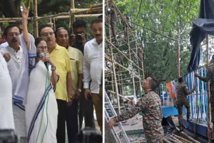 গান্ধী মূর্তির পাদদেশে তৃণমূলের অস্থায় ধরনা মঞ্চ ভেঙে দিল সেনা, ঘটনাস্থলে মুখ্যমন্ত্রী মমতা বন্দ্যোপাধ্যায়। ছবি: রাজীব বসু ভাষা সন্ত্রাসের বিরুদ্ধে তৃণমূলের আন্দোলন নতুন মোড় নিল সোমবার। মেয়ো রোডে ত...